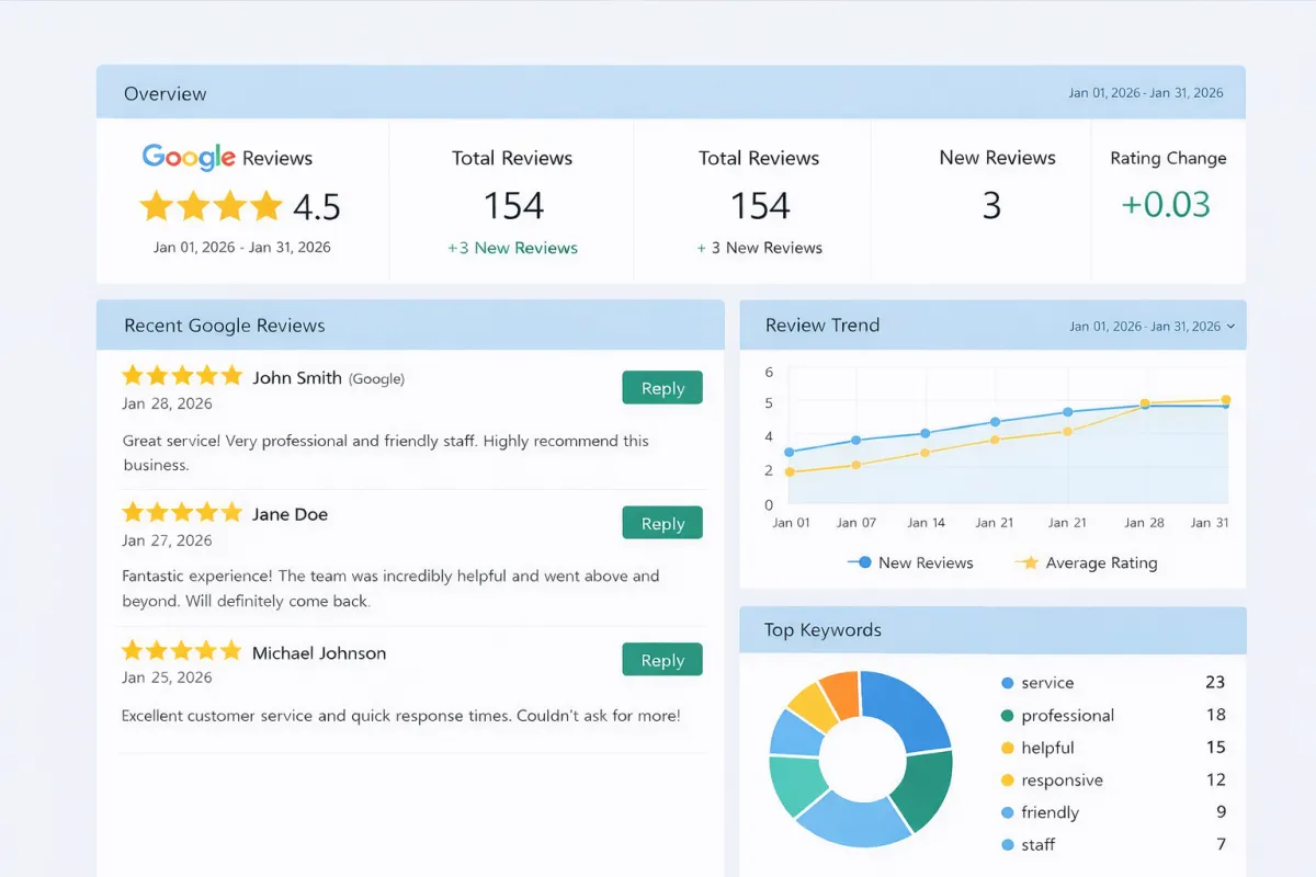 Analyse trends, keywords, and rating changes to improve service and boost local SEO.